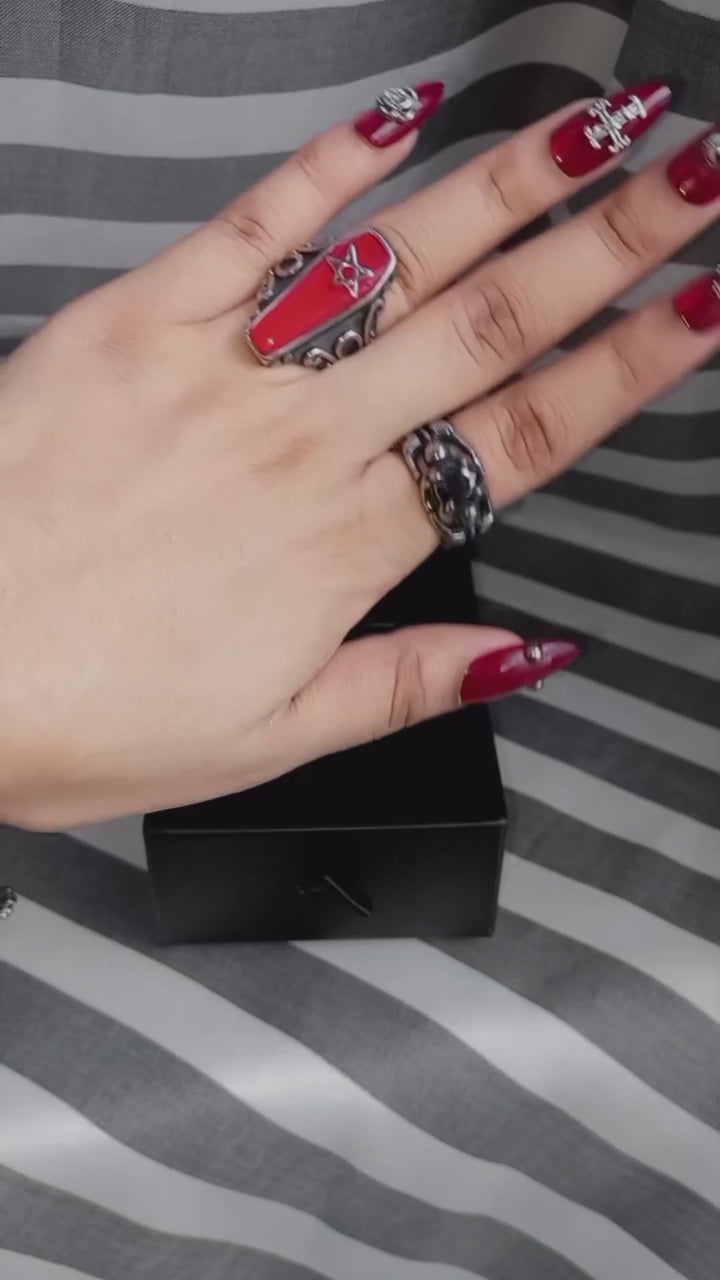 Unlock your inner darkness with our Gothic Coffin Pentagram Stainless Steel Ring. Well crafted with attention to detail, this ring embodies the very essence of Gothic elegance. The red oil dripping process makes the five-pointed star particularly conspicuous. The five-pointed star symbolizes protection and spiritual balance, making this accessory a must-have for anyone who appreciates symbolism and style. Crafted from high quality stainless steel, this ring is durable enough to ensure years of wear and enjoyment. Blending mystery with modern chic, this unique piece makes a bold statement.