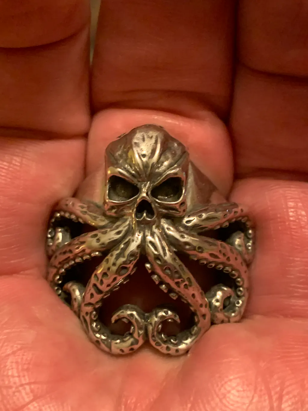 Dies ist aufgrund seines einzigartigen Designs, seiner Politur und der gedrehten Oktopusbeine mit fein detaillierten Saugnäpfen ein nicht-traditioneller Totenkopfring. Ein großartiges Beispiel für das Talent unserer Juweliere, die unsere spektakulären Stücke kreieren. Das Stück ist ein Hingucker und somit ein besonderes Unikat für Ihre Schmuckkollektion. Herrenring aus Sterlingsilber, Herrenring mit Oktopus-Tentakel!!!