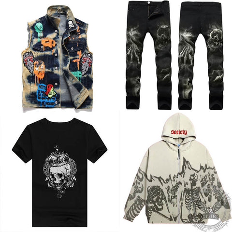 Totenköpfe werden nicht nur in Schmuck, sondern auch in Kleidung verwendet. Totenkopf-Kleidung wird auch von vielen trendigen jungen Leuten bevorzugt. Die eigentliche Verwendung von Totenköpfen als Dekoration in der Neuzeit begann mit Alexander McQueen, einem britischen Modezauberer, der einen Schal mit Totenköpfen bedruckte. Infolgedessen wurde der Trend zu Totenköpfen immer heftiger und wurde von vielen namhaften Designern bevorzugt. Der künstlerische Ausdruck von Skeletten auf Kleidung ist vielfältiger. Ob Top-T-Shirt, Frühlings- und Herbstjacke, Jeans etc. Es kann mit Totenkopf-Prints kombiniert werden und die Formen sind vielfältig. Der künstlerische Ausdruck ist übertrieben und geradlinig, was eine starke visuelle Wirkung hat und beeindruckend ist.