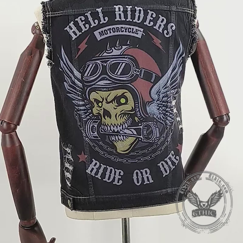 Prepare for pure defiance! This Punk Hell Riders Wings Skull Print Denim Vest is an absolute declaration of allegiance. Crafted from high quality cotton denim, its monstrous back skull print (complete with biker wing helmet) embodies the "Hell Riders" creed. With "Ride or Die" emblazoned below, this isn't just a denim vest; it's a roaring challenge to fate. Seriously punk biker spirit. Own the asphalt.