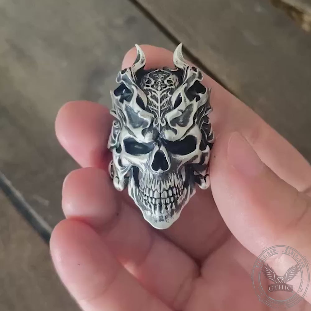 Anillo de calavera de plata de ley samurai con cuernos de dragón