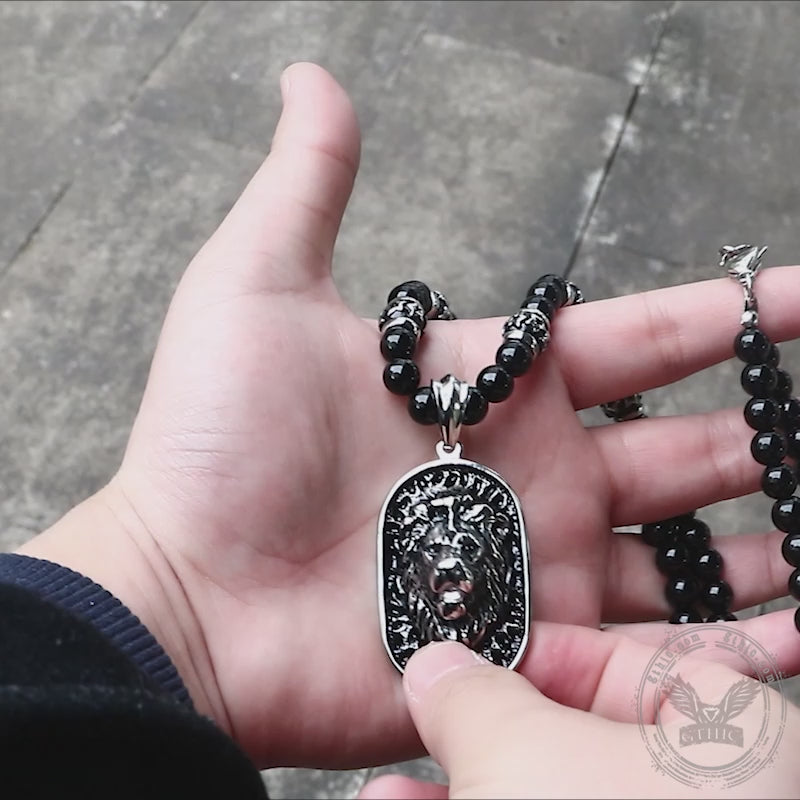 Lion Head Black Beads Chain Stainless Steel Necklace | Gthic.com
