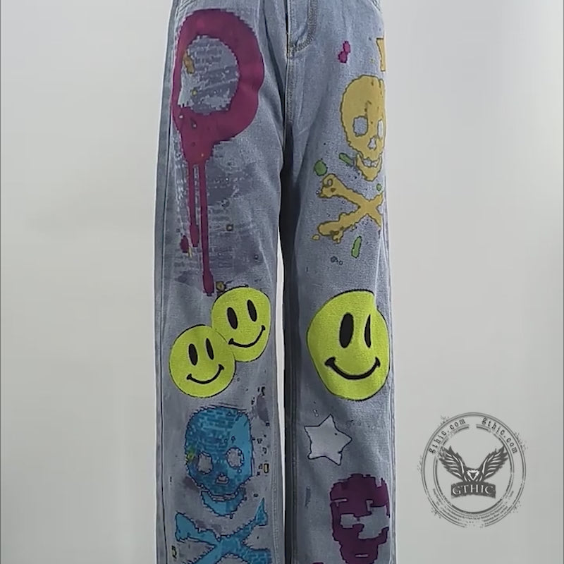 Fashion Street Graffiti Smiley Skull Print Wide-Leg Jeans