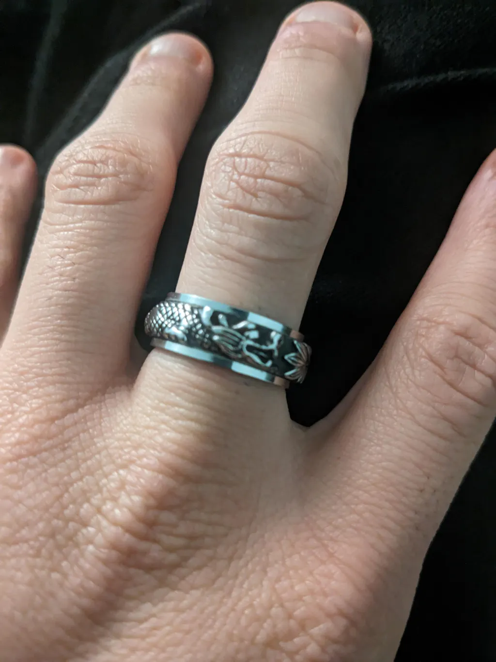 Gift for my S.O. with an engraving. A lovely and good quality ring - appreciate that they included a ring sizing tape too. Loved that it also spins. The design is very pretty!