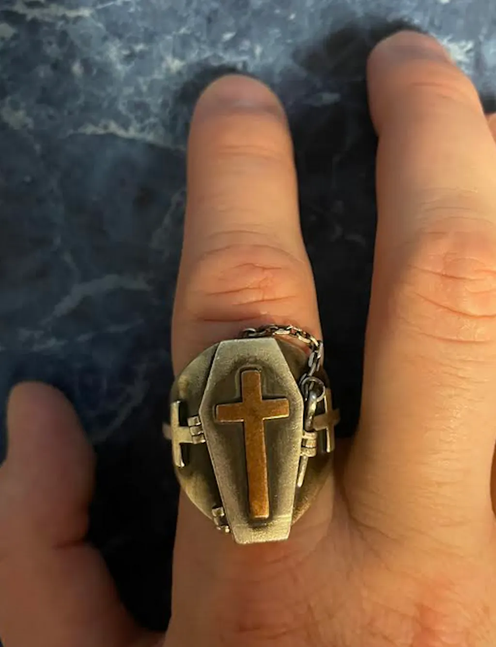 L'anello è realizzato in argento 925 e la croce sulla bara è realizzata in due materiali, rame e oro 24K. Il teschio nella bara è di ottone.
