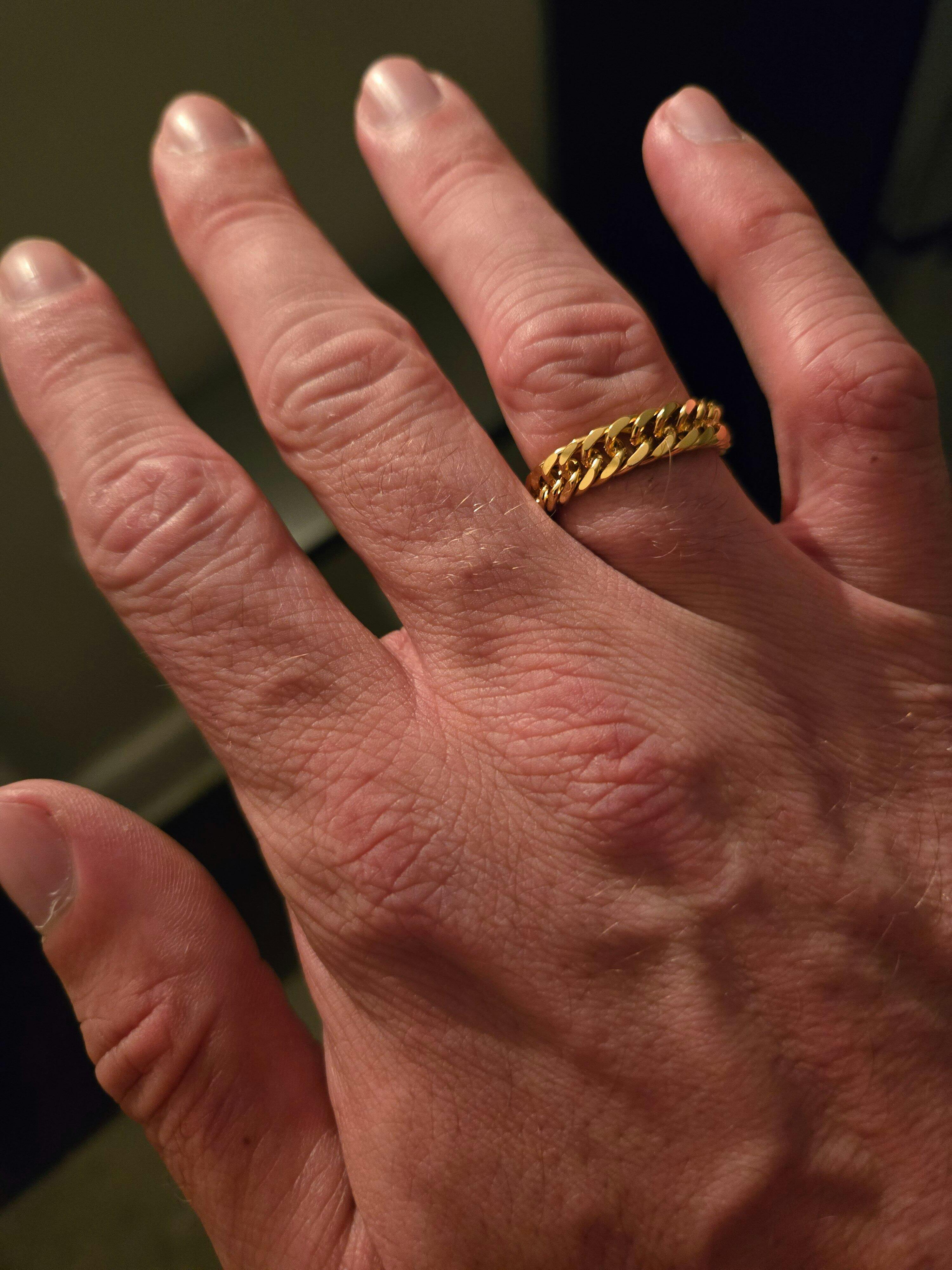 The Cuban link design for a ring is original and bold, but it's slightly uncomfortable due to its texture. In hindsight the plain steel color would have been a better choice. The gold color is not real gold, of course, and that can give a costume jewelry aesthetic