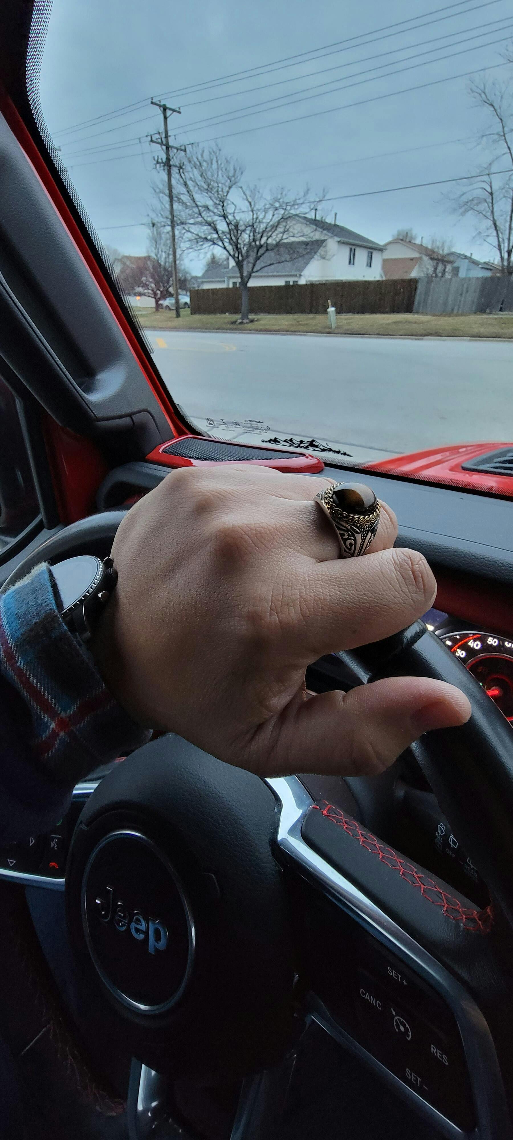 This ring is adorned with a black natural stone with irregular white lines. The ring is decorated with a symmetrical vintage pattern on both sides and is set with many small black zircon stones with a gold background for a design. The ring is made of stainless steel with details that give the ring a superb quality.
